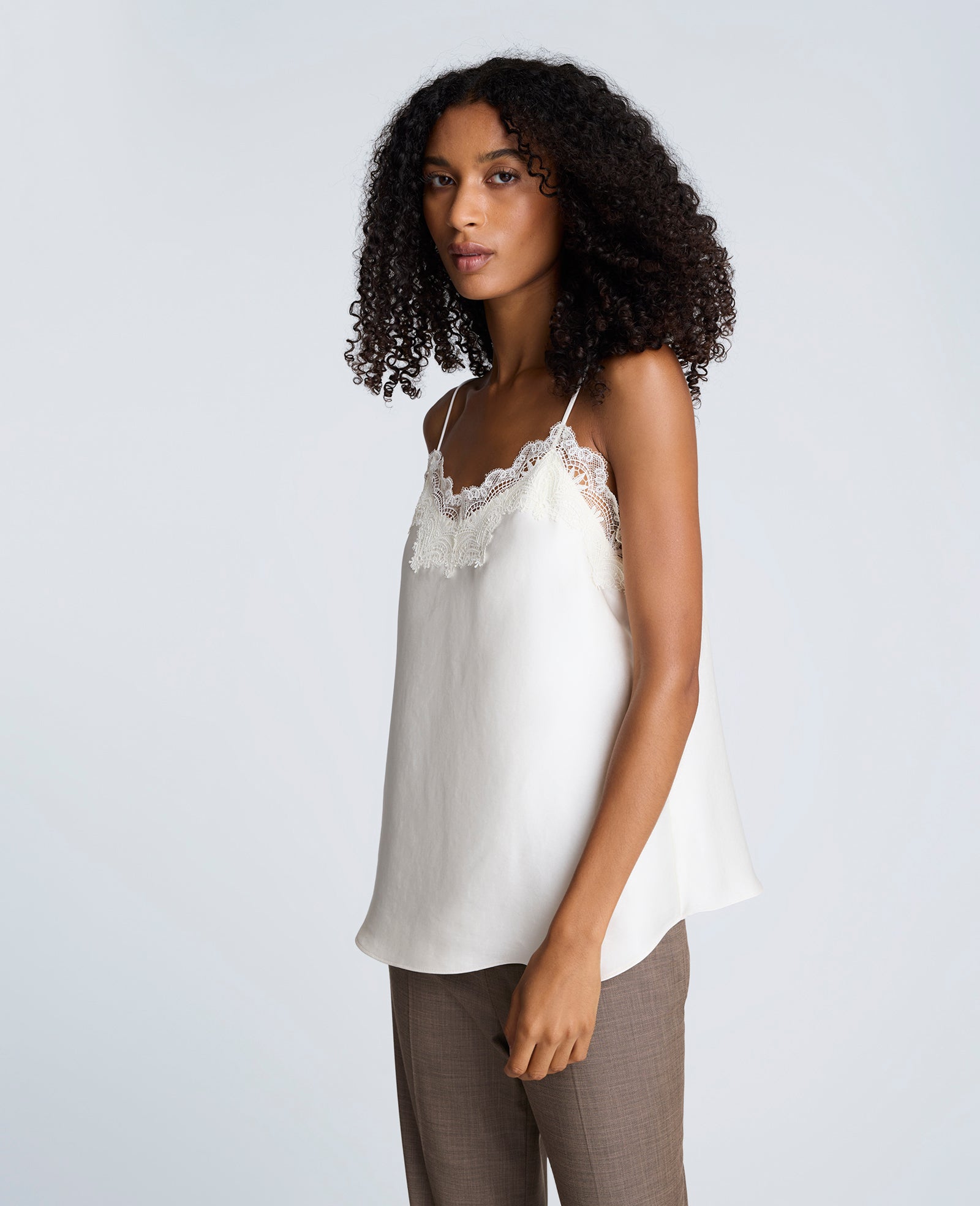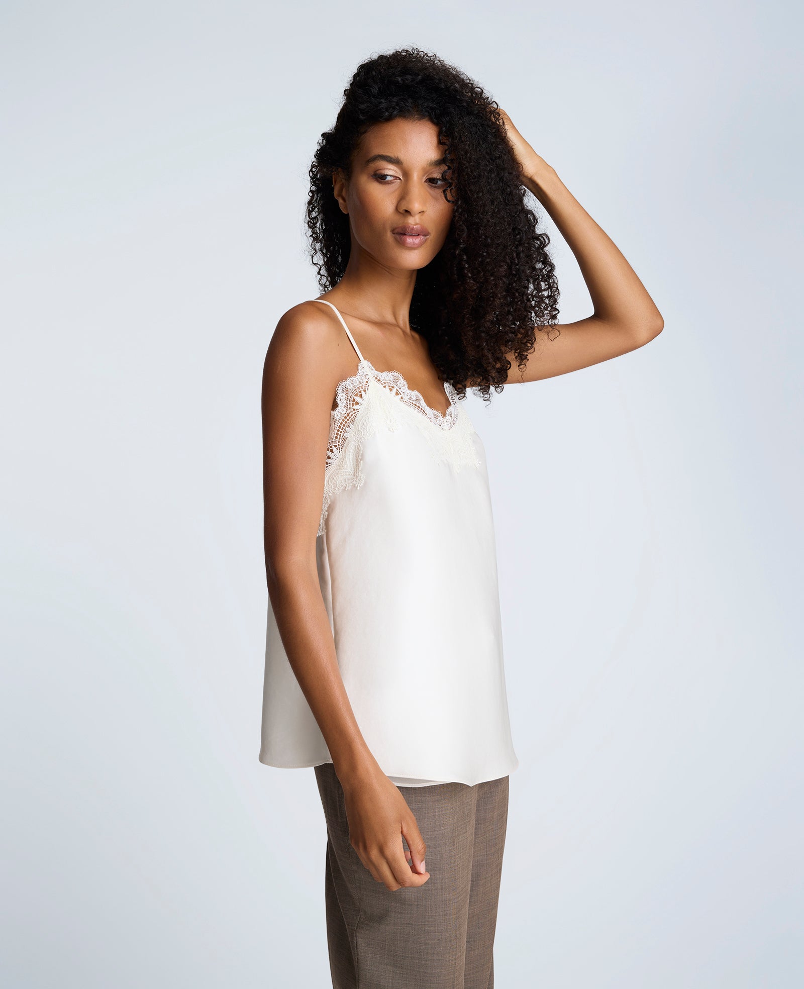 Esta camisa tipo lencera en satén se distingue por su delicado encaje en el escote, que aporta un toque romántico y femenino a una prenda de líneas limpias. Con un diseño de tirantes finos y corte al bies, se adapta suavemente a la silueta, realzando el cuerpo con una caída natural y fluida.